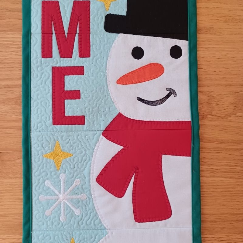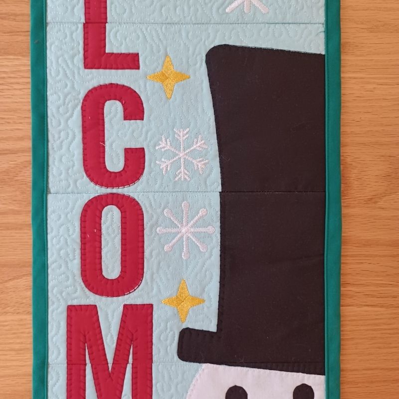Welcome family and friends with this Snowman Welcome Hanger. Hang it on your front door, in your entrance way or in your living room. It will sure add to the Christmas cheer. Panels are made in the hoop. The applique method is super quick and easy to do with everything trimmed ITH. You will have your hanger ready in no time. The panels are joined together and the backing and binding is done with a sewing machine.