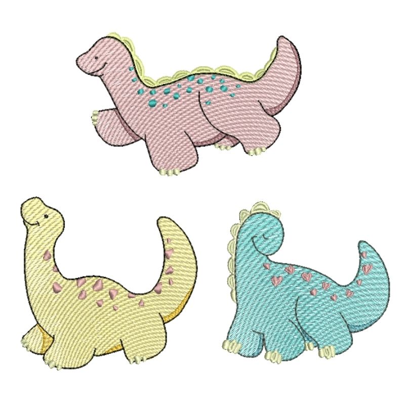 Cutie Pie Baby Dino's. 6 designs in 2 sizes, For 4x4 and 5x7 hoops. These are open work / contour designs and the fabric will show through. These designs are best stitched on plain fabrics such as white or cream fabric.