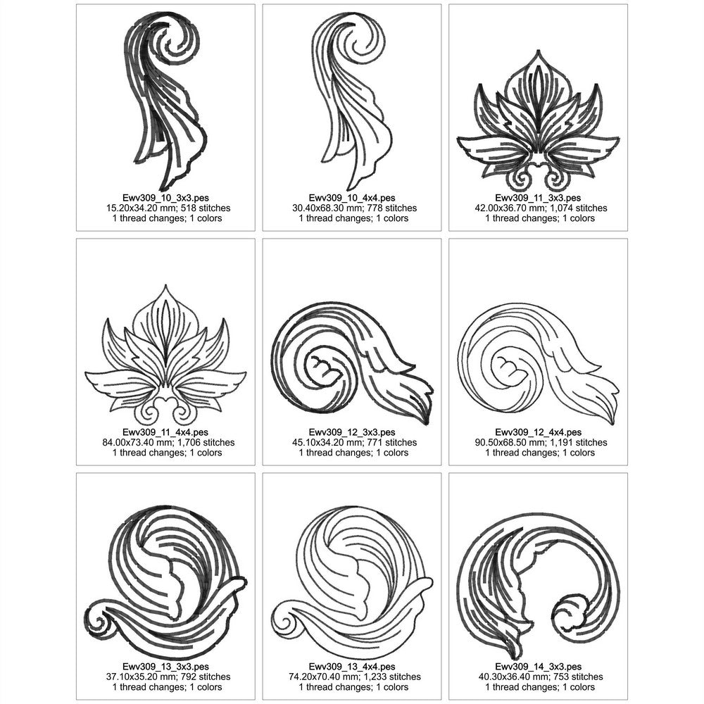 Acanthus leaf Elements pack consists of 22 designs in various sizes that fit 3"x3" and 4"x4", that is 44 designs in total to create quilting patterns, decorative cushions, table cloth edges and any other project you want to add some detail.