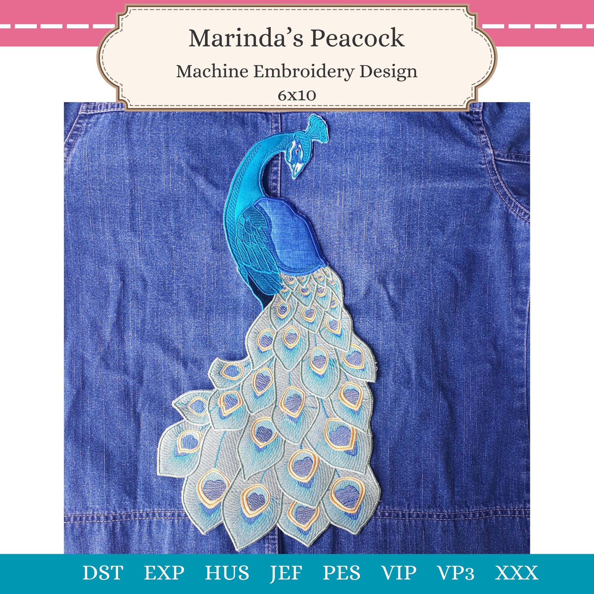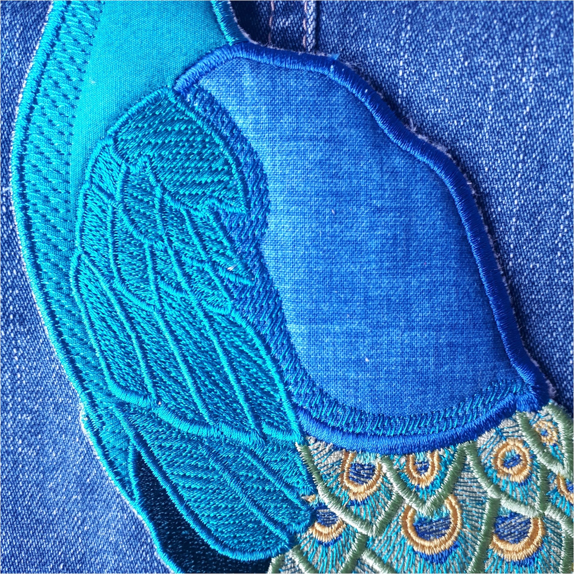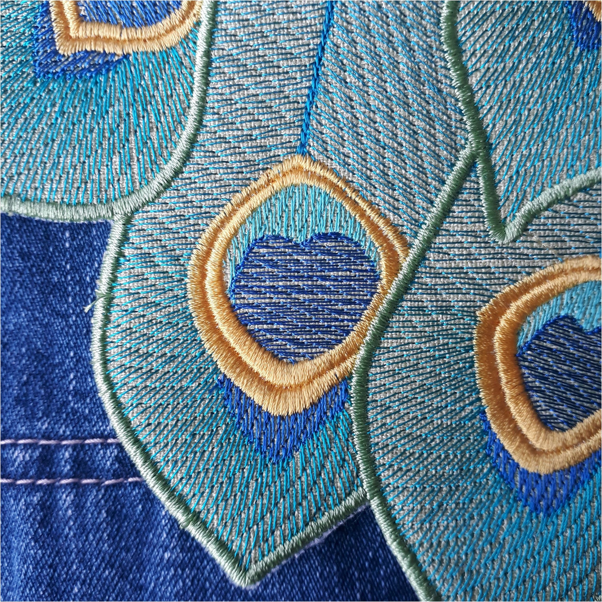 My friend Marinda asked for a Peacock design for the back of her denim Jacket. This is what I came up with. The Peacock is made as an applique in 3 hooping’s. It uses placement and alignment to make a single piece design. This is a design for experienced embroiderers that have done placement before.