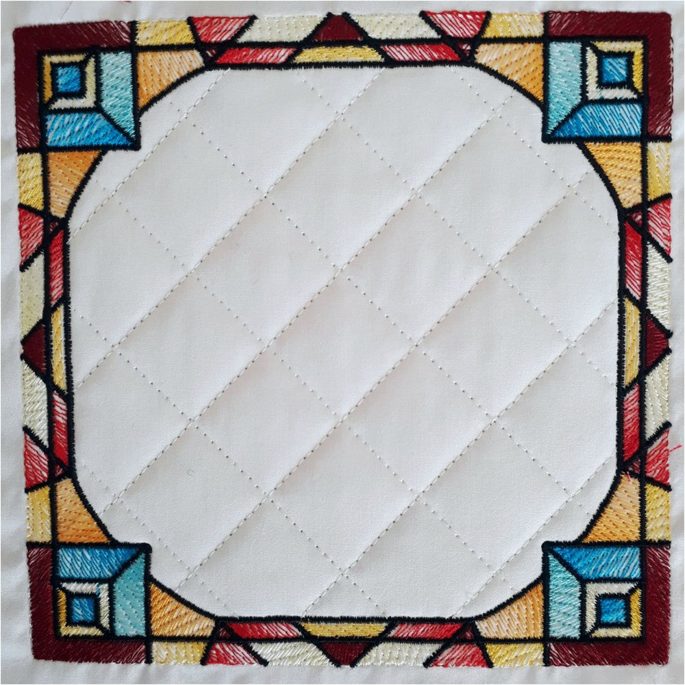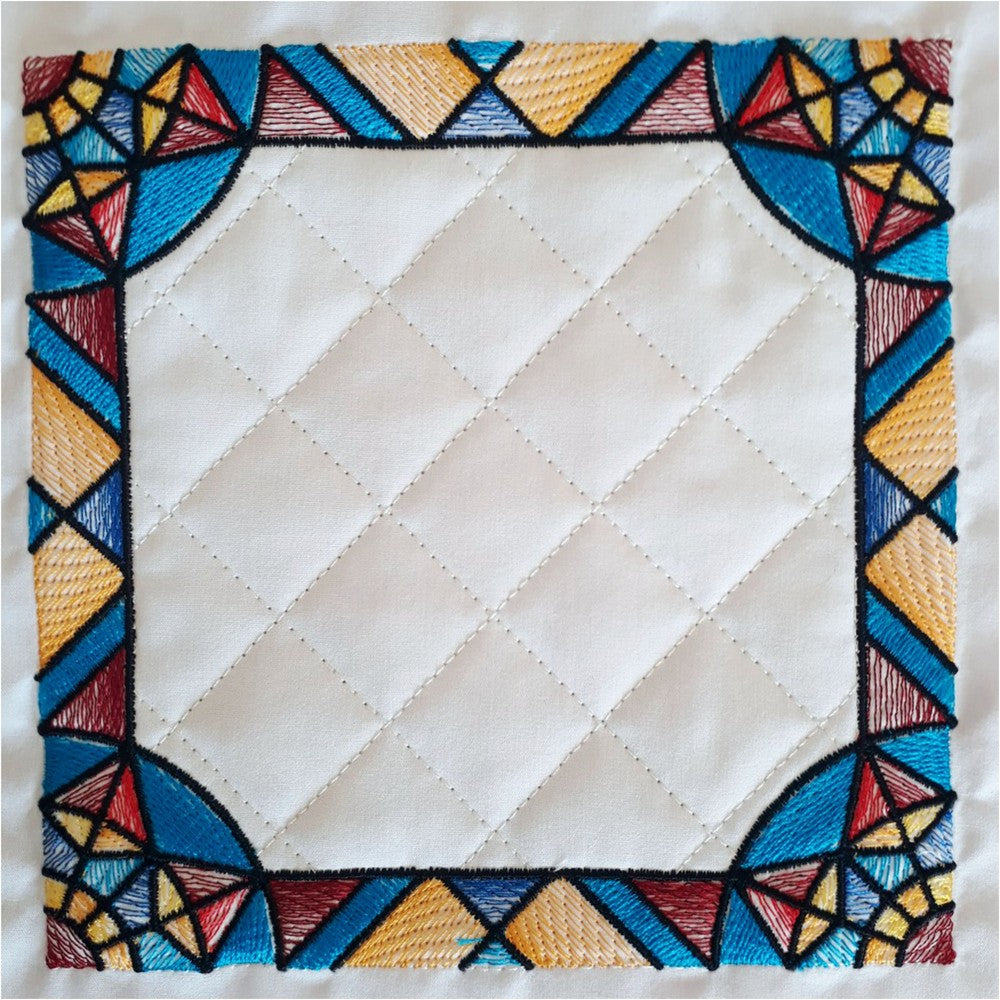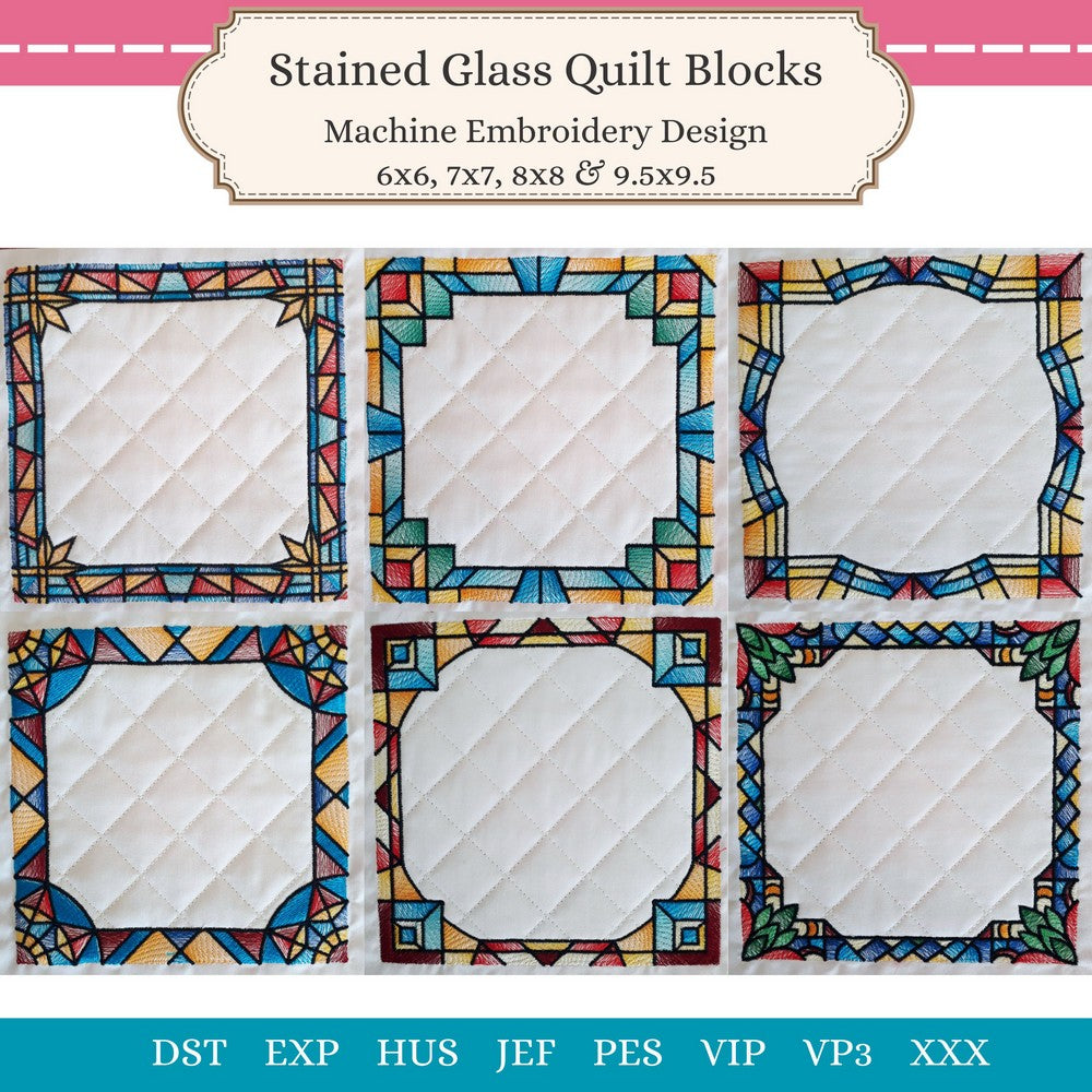 Made as a special request, these Stained Glass Quilt Blocks are perfect for personalizing for a church wall hanger to which you can add Bible verses. These blocks are great for Christmas or Easter celebrations. They are very straight forward to make and the bright colours give these blocks the translucent effect of stained glass. Block sizes are 6"x6", 7"x7", 8"x8" and 9.5"x9.5" (9.5"x9.5" blocks are only DST, EXP, PES & XXX)